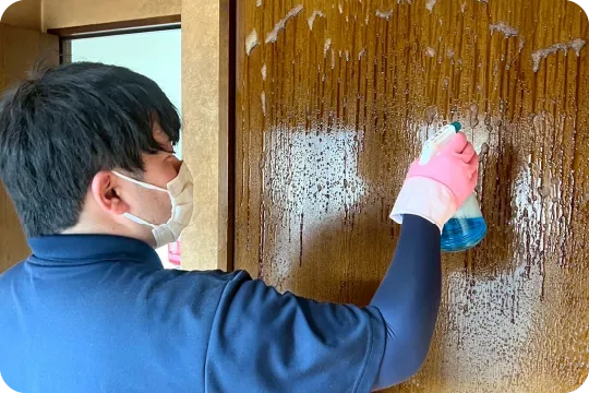 遺品整理後のお部屋は、専用の洗剤や機材を使い、普段の掃除では落ちにくい汚れやカビまで徹底的に清掃します。